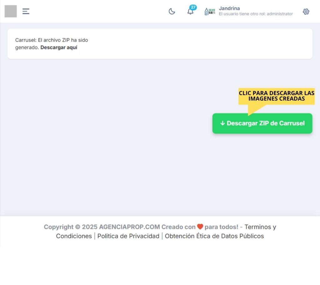 Si todo sale bien, haz clic en “Descargar aquí” o en el botón flotante “Descargar ZIP de Carrusel”.