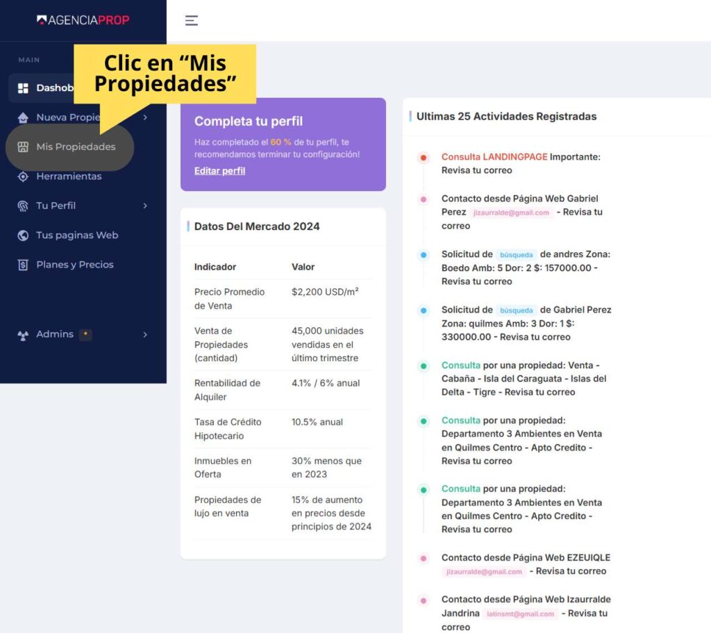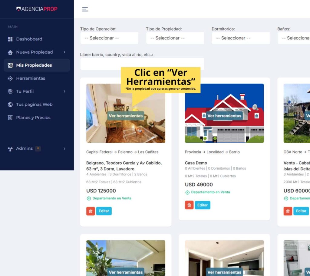Clic en “Mis Propiedades” para ver todas tus propiedades disponibles. Si aún no la ingresaste puedes hacerlo aquí con IA o aquí de forma manual.